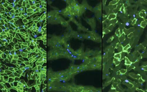 Dystrophin(浅绿色)在正常小鼠中(左);Dystrophin在DMD小鼠中(中);Dystrophin在经CRISPR/Cas9治疗的DMD小鼠中部分恢复(右)。