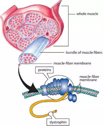 DMD是由于编码dystrophin蛋白的基因编码缺陷造成的。Dystrophin是一条长蛋白质链,由一个包含79个外显子的基因所编码。如果有任何一个外显子发生破坏性突变,这一蛋白质链就无法构建起来。