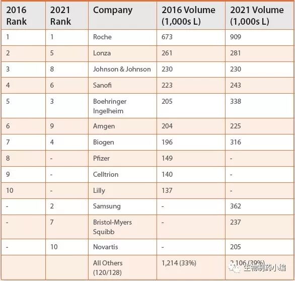 另外值得注意的是,大药厂基于不同的研发策略其产能将发生有趣的变化。Pfizer和Amgen基于青睐于更小更灵活的一次性工艺,其总产能加不断下降。而基于对抗体药物的大力投入,诺华在2021的产能可能会达到20.5万升,届时可能会来到第十位。