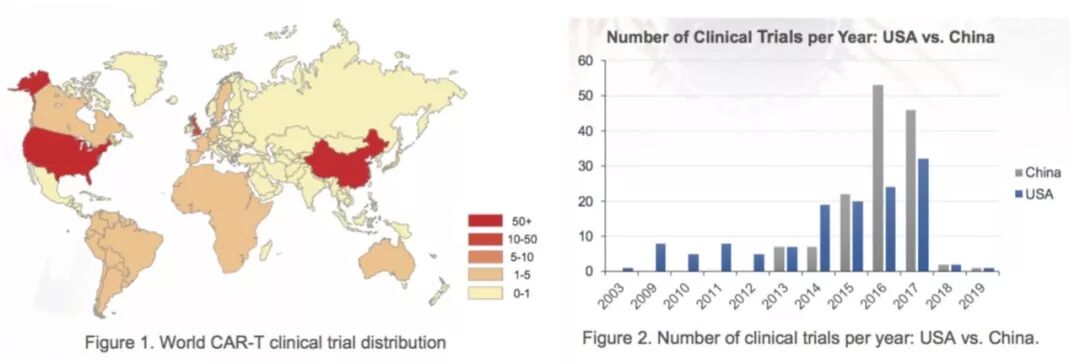 图片来源 Creative Biolabs。The Global CAR-T Clinical Trial Review。左图:世界范围内 CAR-T 临床试验数目分布。右图:中美 CAR-T 临床试验数目按年份比较。