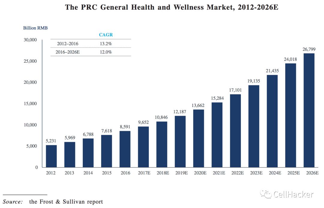 图片来自参考文献 4。中国的大健康和保健市场。来自 the Frost & Sullivan 的分析报告。2012 - 2016 年的历史数据和2016 - 2026 年的预期数据。