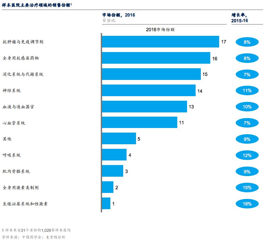 图片来自参考文献 3。来自 31 个省份的 1029 家样本医院主要治疗领域的销售份额。2015 年到 2016 年销售额占比及排名基本稳定。抗肿瘤与免疫调节、全身用抗感染药物和消化系统与代谢系统为前三大治疗领域,合并共占市场份额比 48%,但增速平缓。全身用激素类制剂和生殖泌尿系统和性激素领域成为增长最快的治疗领域,尽管其市场份额基数较小。