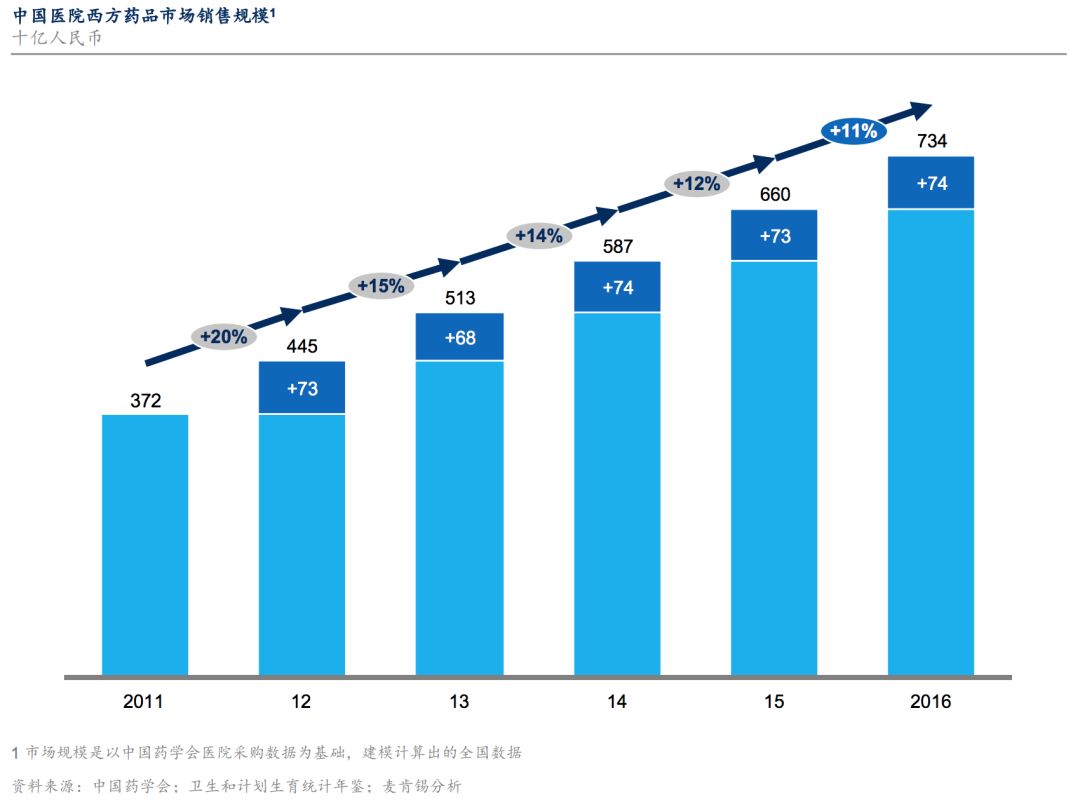 图片来自参考文献 3。中国医院药品市场销售规模(单位:十亿人民币)自 2011 年至 2016 年增长 2 倍,但近年来增速一直在逐步放缓。2016 年,中国医院药品市场规模达到 7340 亿元,2011 - 2016 年间复合增长率约为 15%;年度增长率到 2016 年降为 11%,新增市场规模达 740 亿元。