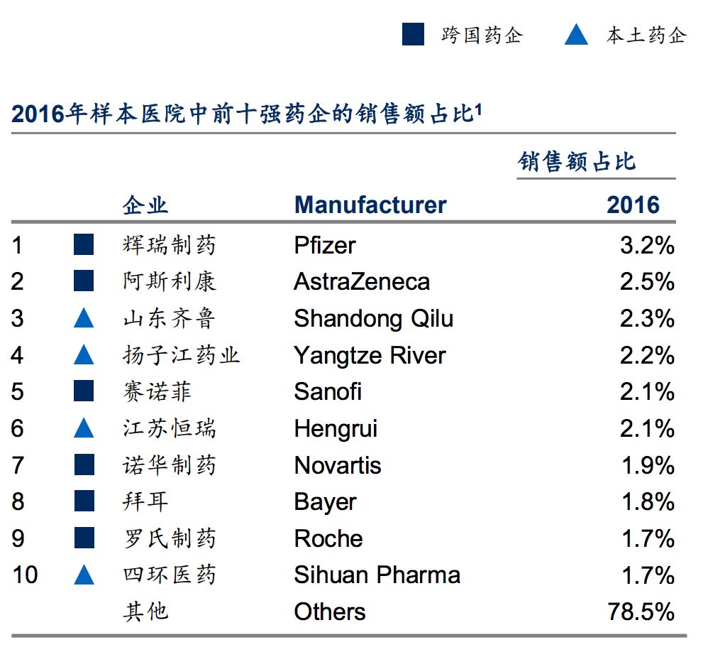 图片来自参考文献 3。2016 年,从来自 31 个省份的 1029 家样本医院医院中,排名前十强药企的销售额占比。前十的医院中有 6 家是跨国企业(辉瑞制药、阿斯利康、赛诺菲、诺华制药、拜耳、罗氏制药)。